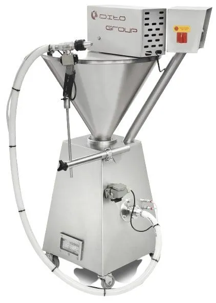 Дозатор работает с помощью пистолета, что позволяет использовать сырье как мягкой, так и более твердой консистенции. Под бункером дозатора установлен шнек, который продвигает массу по шлангам к пистолету. На пистолете имеется пневматический клапан для открытия и закрытия дозирующего сопла.
