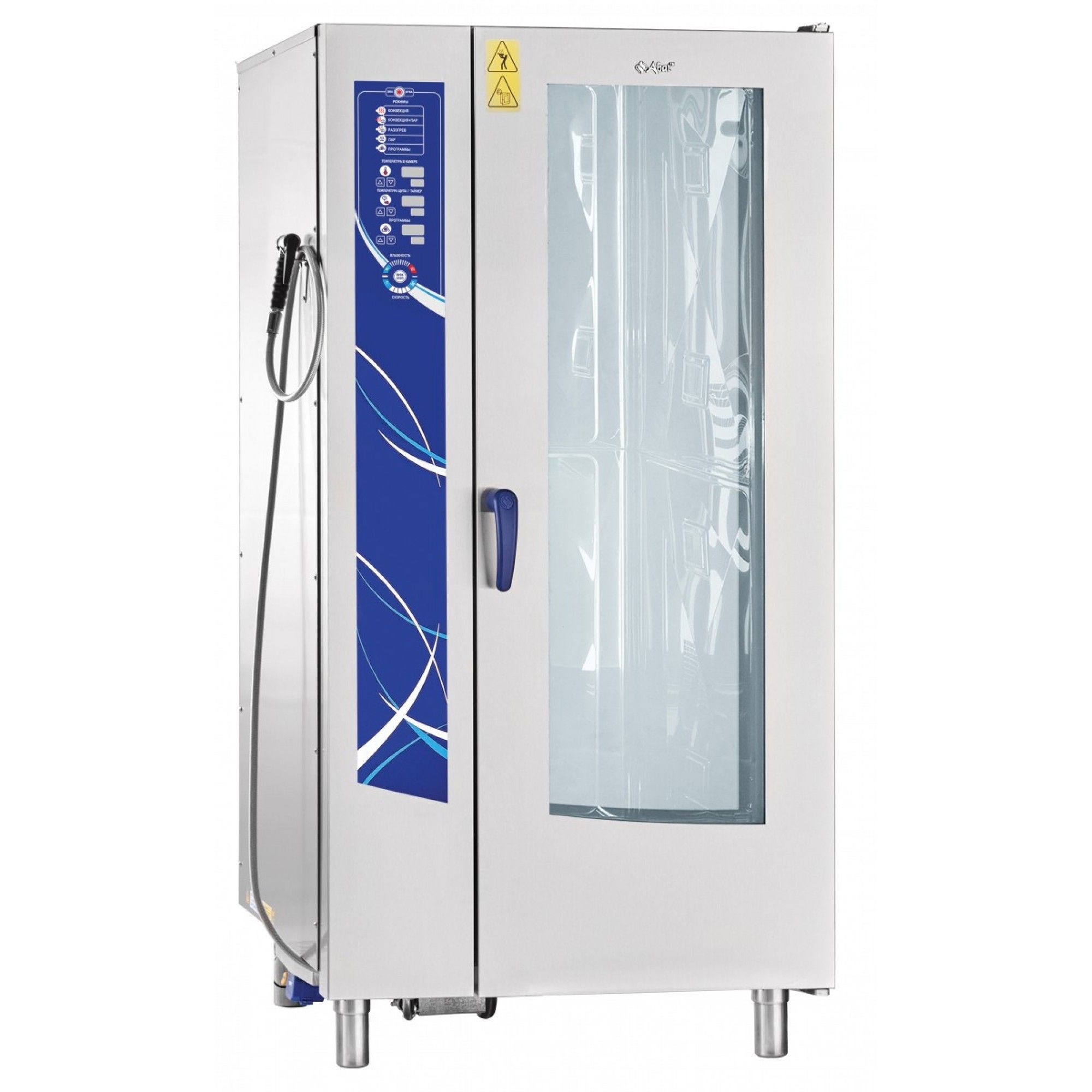 - Двухходовый механизм открывания дверцы для защиты персонала от горячего пара.