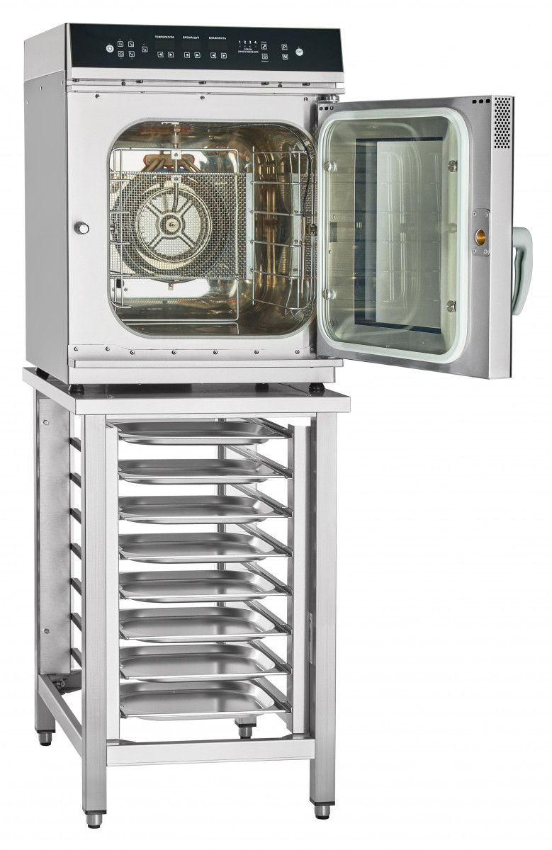 Оборудование оснащено электронной панелью управления, обеспечивающей точную настройку температуры и режима приготовления. Пароконвектомат имеет 6 уровней для размещения гастроемкостей стандарта GN 1/2, что позволяет готовить несколько блюд одновременно.