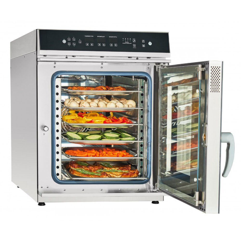 Пароконвектомат предлагает пять основных режимов приготовления для различных технологических задач. Режим конвекции (+30°C...+270°C) обеспечивает нагрев ТЭНа без подачи воды. Комбинированный режим конвекции с паром (+30°C...+250°C) позволяет регулировать влажность в камере. Специальный режим разогрева с паром (+30°C...+160°C) предназначен для щадящего разогрева готовых блюд. Низкотемпературный пар (+30°C...+98°C) обеспечивает деликатное приготовление продуктов, а режим пара (+100°C) работает с периодической подачей воды.