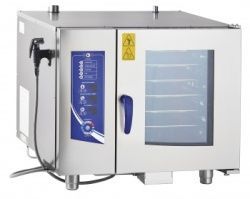 - Доступны устройства с различными вариантами подключения. Наибольшим спросом пользуются электрические 6-уровневые пароконвектоматы на 380 В, поскольку трехфазная сеть является стандартной на профессиональных кухнях. Газовое оборудование обычно дороже, но менее затратно в эксплуатации. Также у нас имеются пароконвектоматы на 6 уровней, работающие от «домашней» сети 220 В, например, некоторые модели Unox.